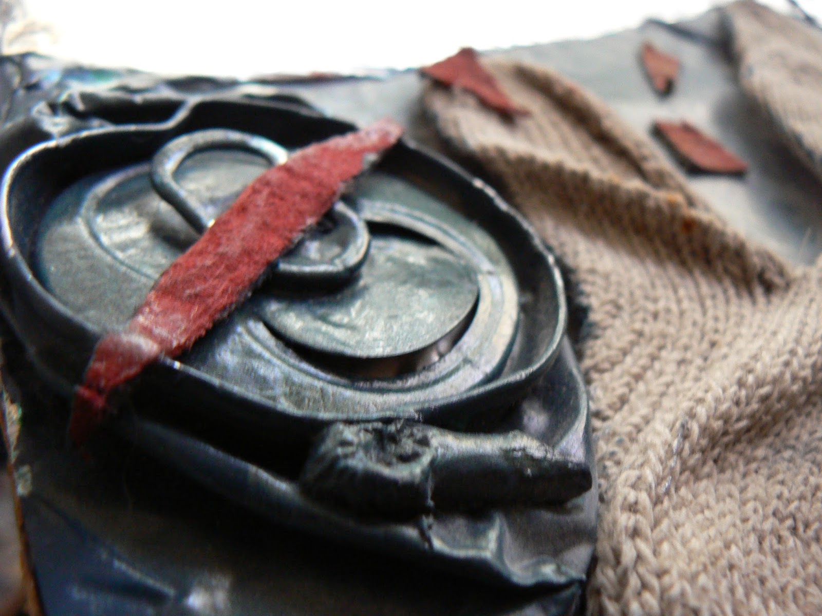 in crinkled tin (below) i see figure approaching with arms up, robe flowing, face towards me. crafted felt behind make the figure float outward. now the tin becomes someone else to me. partial lifenote is already a love=note to me. one who lifts and supports and tears up my eyes with joy.